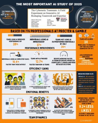 Daarnaast leverde het gebruik van AI aanzienlijke efficiëntiewinst op. Individuen met AI voltooiden hun opdrachten gemiddeld 16,4% sneller en produceerden daarbij meer gedetailleerde en doordachte oplossingen. Teams met AI waren 12,7% sneller klaar dan teams zonder AI.
