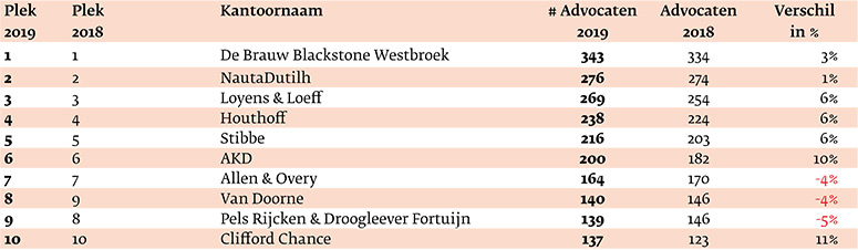 In de top 10 laten veel kantoren aanzienlijke stijgingen zien. Clifford Chance ging van 123 naar 137 advocaten (+14, een stijging van 11 procent) en was binnen deze groep procentueel gezien de winnaar. Ook AKD (+18, een stijging van 10 procent), Loyens & Loeff (+15, een stijging met 6 procent), Houthoff (+14, een stijging van 6 procent), Stibbe (+13 ook een stijging van 6 procent) en koploper De Brauw Blackstone Westbroek (+9, een stijging van 3 procent) groeiden flink. NautaDutilh deed het rustig aan: +2, een stijging van 1 procent.