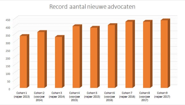 In de jaren 2012, 2013 en 2014 nam het aantal advocaat-stagiairs gestaag af. Op het dieptepunt in het tweede cohort van 2014 bleef het aantal nieuwkomers steken op 332. De negatieve trend werd in 2015 al omgebogen.