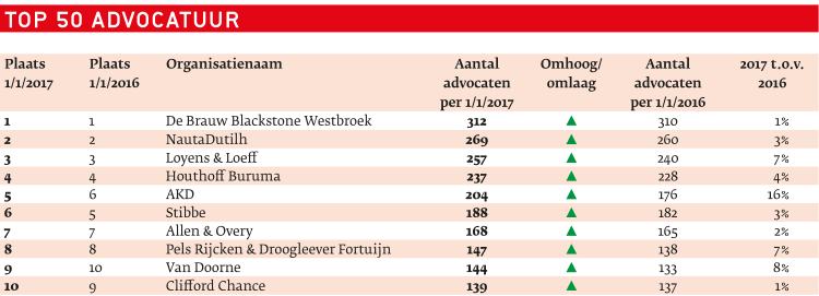 Ook dit jaar presenteert Mr. het overzicht van de top 50 advocatenkantoren in Nederland, gemeten naar aantal advocaten. Na een kortstondige teruggang in 2014 was er in 2015 weer ruimte voor groei en in 2016 is die lijn doorgezet. Het aantal advocaten bij top 50 kantoren groeide met 1,5 procent wat met name te danken is aan de top 10 die een stijging van ruim 10 procent liet zien.