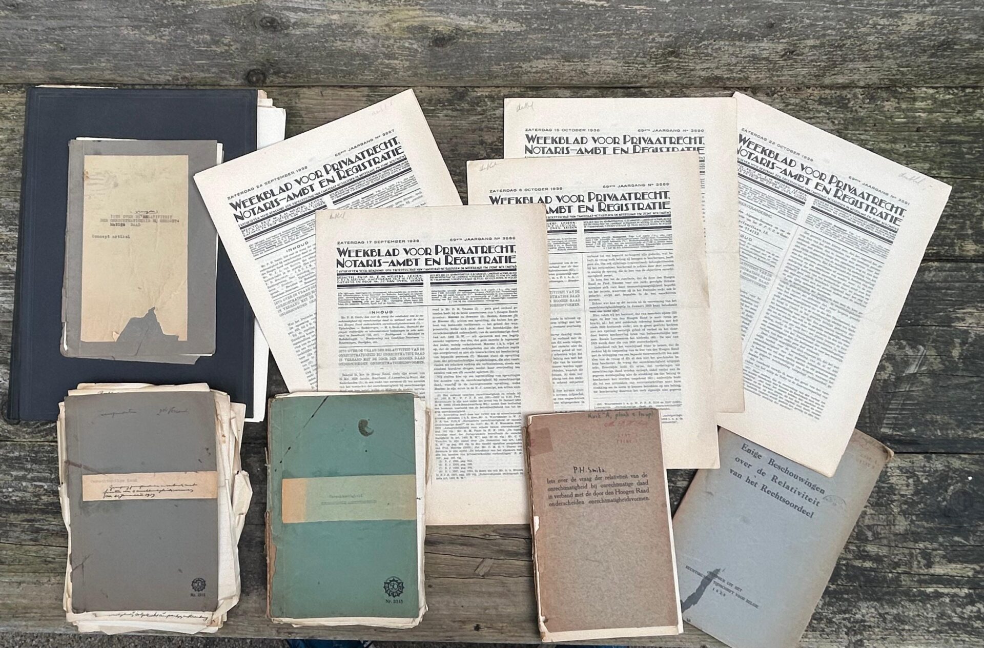 “Mijn grootvader publiceerde eind jaren dertig over relativiteit en de onrechtmatige daad”, zegt Pieter Smits tegen Mr. over de bijzondere erfstukken. “Een benadering die later in de juridische literatuur bekend werd als de relativiteitsleer, of ook wel de Leer Smits.” In de bibliotheek in het ouderlijk huis van de familie is allerlei materiaal over dit juridisch-historische leerstuk gebundeld in een verzamelmap, vertelt hij verder. “Daarin zitten onder andere de oorspronkelijke vijfdelige publicatie van de Leer Smits in het WPNR uit 1938, de eigen aantekeningen van onze grootvader, zijn jurisprudentieoverzicht, én een originele overdruk van de publicatie. Het is bijzonder om te beseffen dat dit leerstuk én de bijbehorende stukken al meer dan 85 jaar bewaard zijn gebleven.”